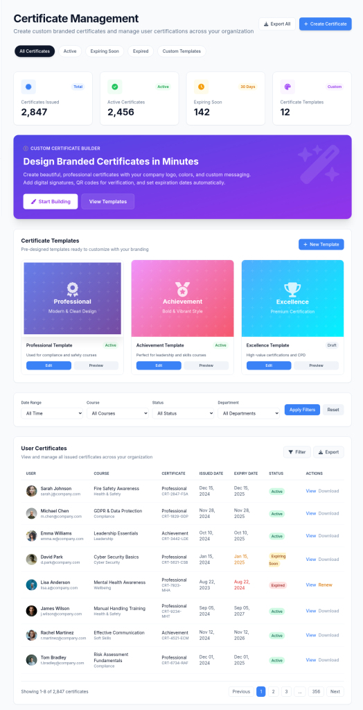 Access powerful reporting, audit trails, printable certificates and advanced analytics — making compliance and training management simple.